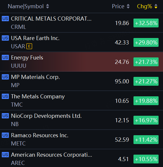 Critical Metals up 33%; USA Rare Earth up 30%; Energy Fuels, MP Materials up over 21%; The Metals up 20%; NioCorp up 17%
