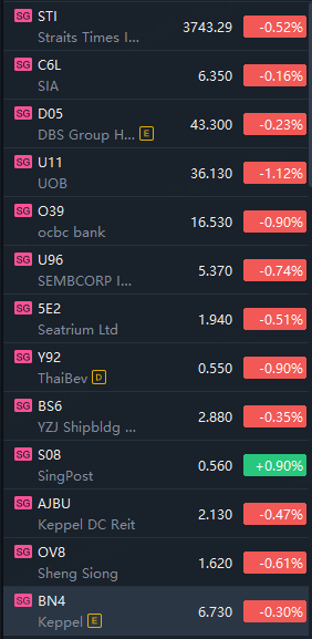 Singapore stocks opened lower on Friday. STI fell 0.5%, SingPost rose 0.9%, UOB fell 1.1%, OCBC fell 0.9%.