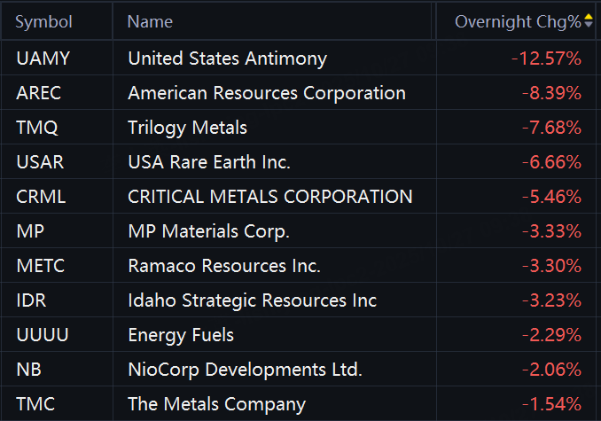 US-listed Rare earth stocks sank in overnight trading. United States Antimony fell 13%; American Resources and Trilogy Metals fell 8%; USA Rare Earth fell 7%; Critical Metals fell 6%; MP Materials, Ramaco Resources, and Idaho Strategic Resources fell 3%; Energy Fuels, NioCorp Developments, and The Metals Company fell 2%.