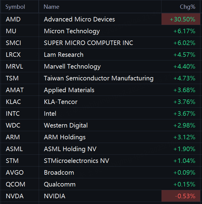 Chip stocks jumped in morning trading. AMD rose 31%; Micron and Super Micro Computer rose 6%; Lam Research and TSMC rose 5%; Marvell Technology, Applied Materials, KLA-Tencor, and Intel rose 4%; Arm and Western Digital rose 3%; ASML rose 2%; while Nvidia fell 0.5%.