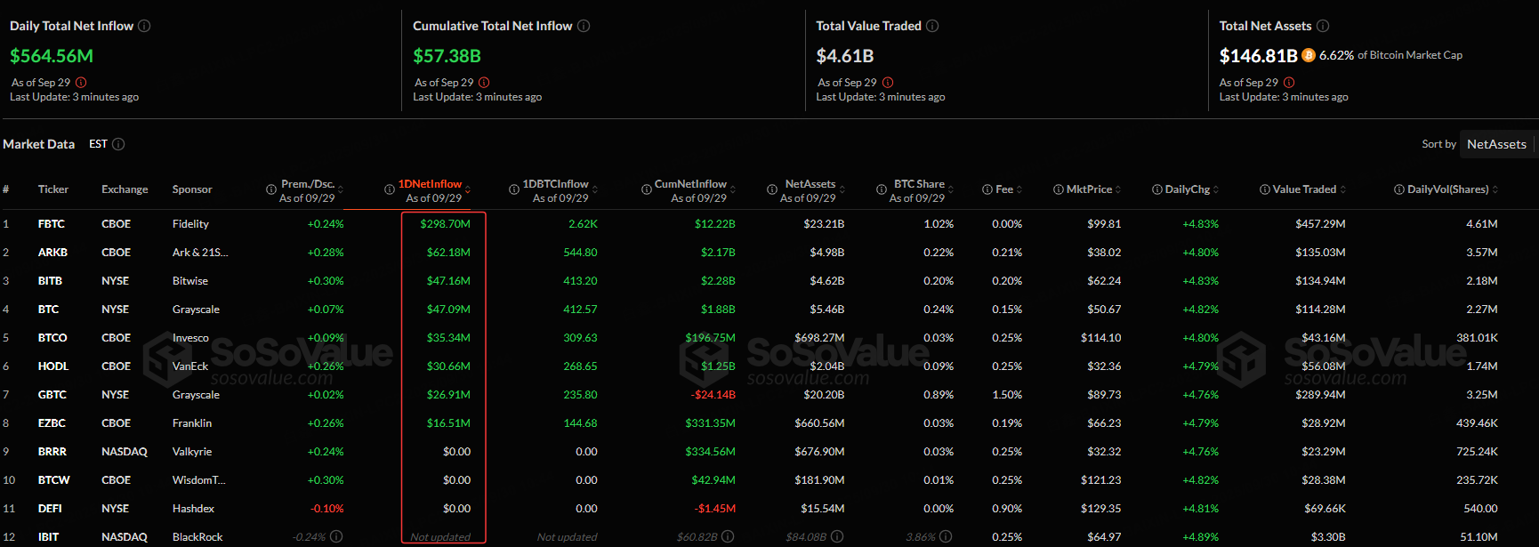 The Bitcoin spot ETF with the highest net inflow on September 29 was Fidelity Wise Origin Bitcoin Fund (FBTC), with a net inflow of $298.7 million, according to SoSoValue.