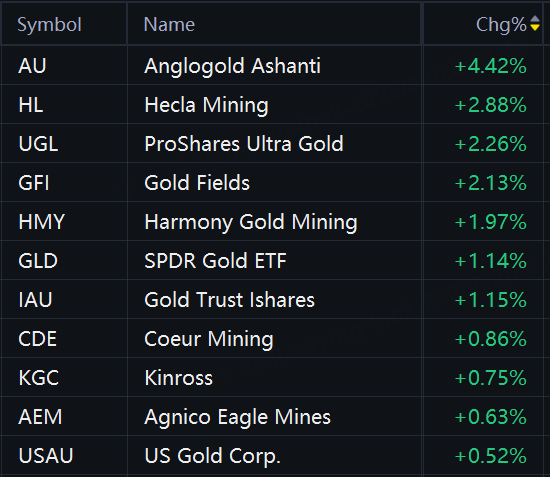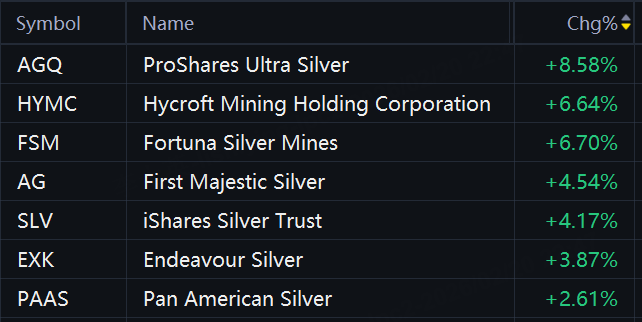 ProShares Ultra Silver rose 9%; Fortuna Silver Mines and Hycroft Mining rose 7%; First Majestic Silver rose 5%; Anglogold Ashanti, iShares Silver Trust, and Endeavour Silver rose 4%; Pan American Silver and Hecla Mining rose 3%; ProShares Ultra Gold and Harmony Gold Mining rose 2%.