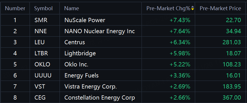 Nuclear stocks rose in premarket trading. NuScale Power, NANO Nuclear Energy up over 7%; Centrus, Lightbridge up about 6%; Oklo up over 5%; Energy Fuels up over 3%.