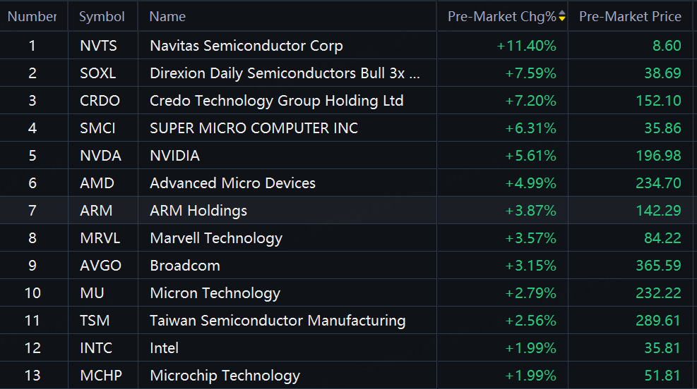 Semiconductor shares rose premarket as investors cheered Nvidia's market-topping earnings. Navitas up over 11%; SOXL, Credo up over 7%; SMCI up over 6%; Nvidia, AMD up about 5%; ARM Holdings up about 4%; Marvell, Broadcom up over 3%.