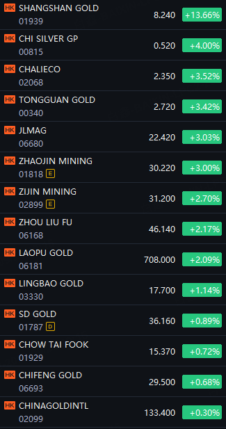 Gold Stocks Rally; Shangshan Gold up 14%; Chi Silver up 4%; Chalieco, Tongguan, JL Mag and Zhaojin Mining up 3%.