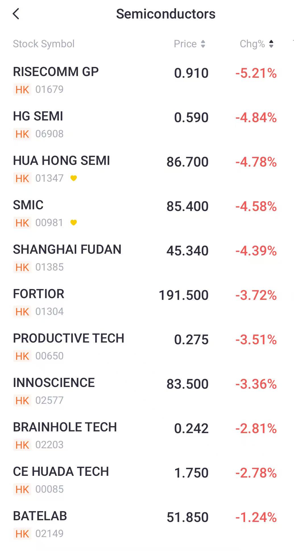 Semiconductor stocks turned down in Hong Kong. Risecomm, HG Semi, Hua Hong Semi down around 5%; SMIC, SHanghai Fudan down over 4%; Innoscience down over 3%.