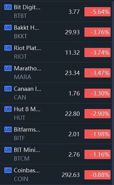 Crypto Stocks dropped in morning trading on Friday. Bit Digital fell 6%; Bakkt Holdings, Riot Platforms and Marathon Digital fell 4%; Canaan and Hut 8 Mining fell 3%; Bitfarms fell 2%; Coinbase fell 1%.