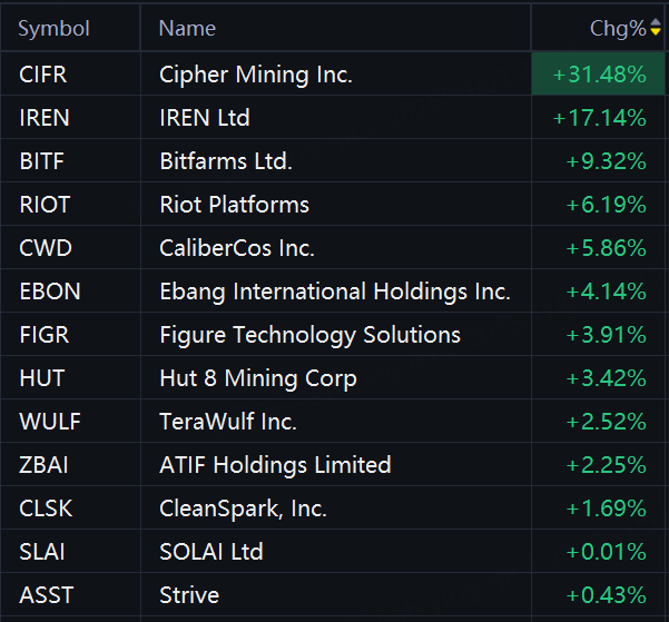 Some crypto stocks jumped in morning trading. Cipher Mining rose 32%; IREN rose 17%; Bitfarms rose 9%; Riot Platforms and CaliberCos rose 6%; Ebang and Figure rose 4%; Hut 8 and TeraWulf rose 3%; CleanSpark rose 2%.