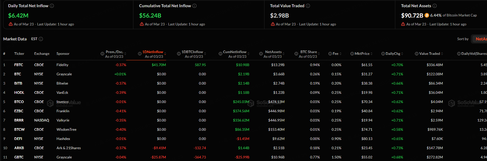 The Bitcoin spot ETF with the highest net inflow on March 23 was Fidelity Wise Origin Bitcoin Fund, with a net inflow of $41.7 million, according to SoSoValue.