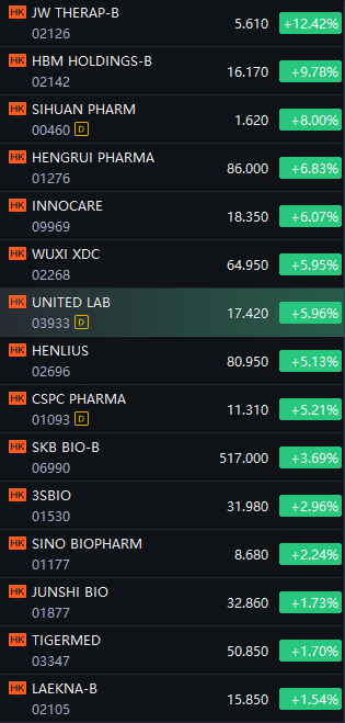 HK pharma stocks saw gains during the trading session. JW THERAP-B surged 12%; HBM HOLDINGS-B up 10%; SIHUAN PHARM rose 8%; HENGRUI PHARMA and INNOCARE gained nearly 6%.