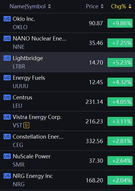 Nuclear stocks rose on Monday. Oklo surged nearly 10%; NANO Nuclear Energy up over 7%; Lightbridge up 5%; Energy Fuels, Centrus up 4%; Vistra Energy up 3%.