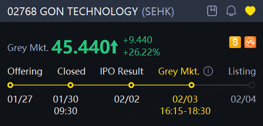 Gon Technology, a supplier of new chemical materials and upstream and downstream products of gelatin and collagen, rose 26% in Hong Kong grey market trading.