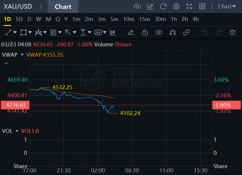 Spot gold plunged 6% to erase its year-to-date gains and trade just above $4,200 an ounce.