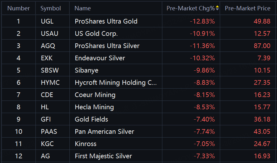 Precious metal shares plunged in premarket trading. ProShares Ultra Gold down 13%; US Gold, ProShares Ultra Silver down about 11%; Endeavour Silver down 10%.