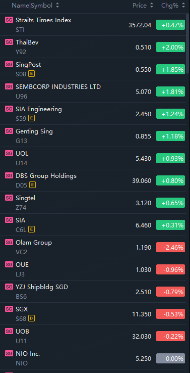 Meanwhile, City Developments (SGX:C09) was up nearly 1% after its wholly-owned subsidiary, Chenghong Investment, jointly acquired a mixed-use development site in Downtown Shanghai for around 8.94 billion yuan.