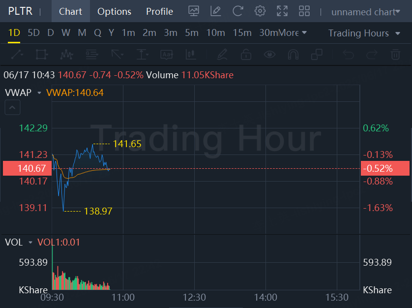 Palantir stock briefly fell 1.9% early Tuesday after having risen in premarket trading. Shares closed 2.9% higher Monday, ending at a record high of $141.41, according to Dow Jones Market Data.