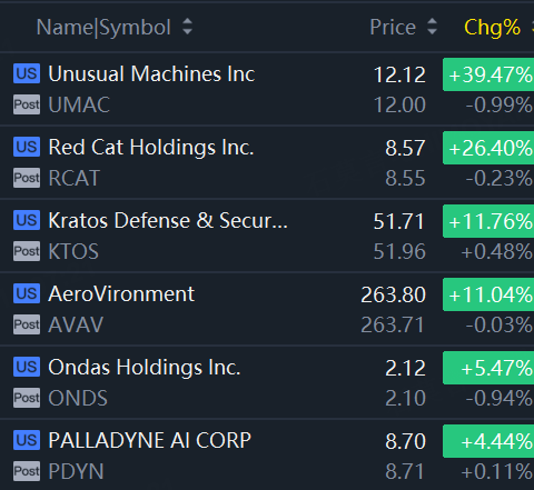 AeroVironment makes guidable, loitering munitions, among other things. Kratos makes tactical unmanned vehicles. Red Cat makes the Black Widow reconnaissance drone, among other things. Unusual Machines makes drone components.