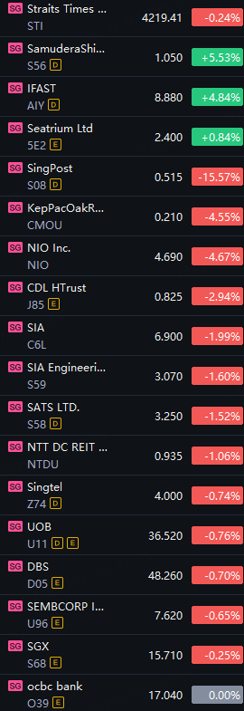 The Straits Times Index (STI), a key benchmark for the Singapore Exchange, ranged between 4,202.25 and 4,234.77 throughout the day. It ended the session at 4,219.41, down 10.00 points or 0.24% compared to Monday's close.