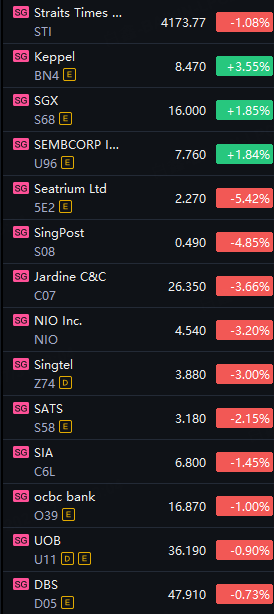 In company news, shares of Seatrium were down over 5% at the close as the company's attributable profit to owners surged to SG$144.4 million during the first half of the year from SG$36.0 million a year earlier.