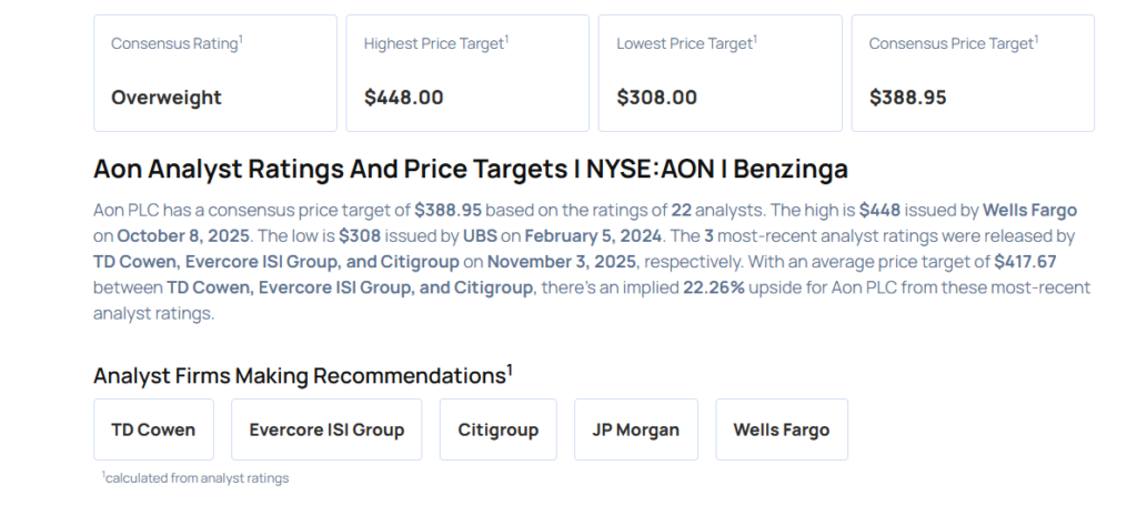 - Evercore ISI Group analyst David Motemaden maintained Aon with an Outperform rating and raised the price target from $427 to $435.