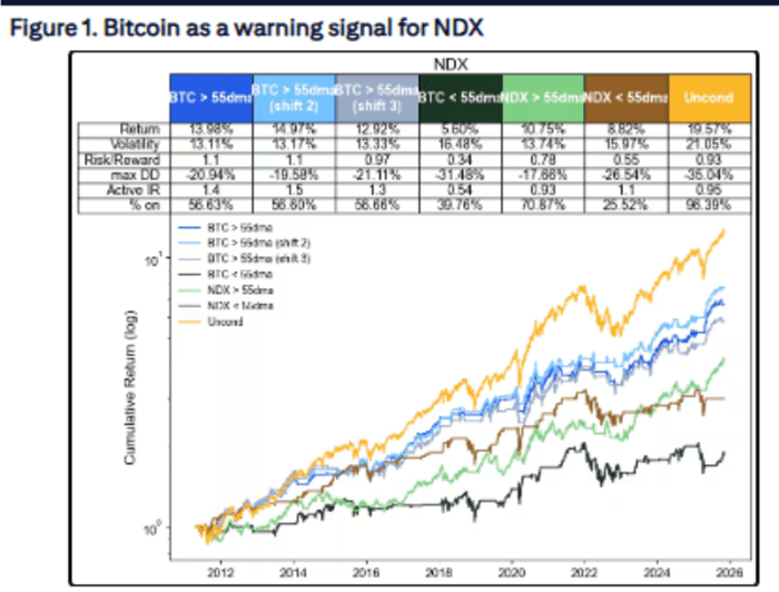 And the problem for tech stocks is that bitcoin acts as a warning signal for the Nasdaq, Citi suggests. “We had shown in the past that NDX trades much better when bitcoin is trading well, and vice versa,” Citi says. “In particular, being long NDX only when bitcoin is above its 55-day moving average (and lagging it by a day) improves the active information ratio for NDX from 0.95 to 1.4 and is similarly significant for longer 2 and 3 day lags.”