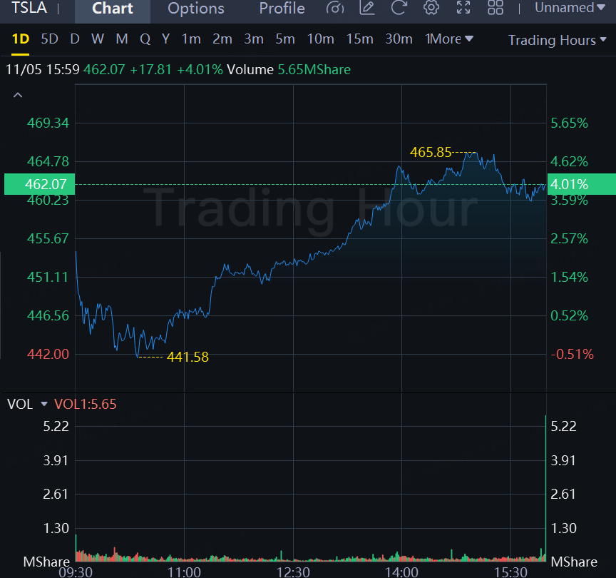 Shares rose 2.6% on Monday, closing above $460 a share for only the sixth time, as investors reacted to comments by CEO Elon Musk about expanding Tesla's robo-taxi business by year's end. Shares dropped 5.1% on Tuesday as the market turned lower, and Palantir Technologies shares fell 8% after the company reported third-quarter numbers.