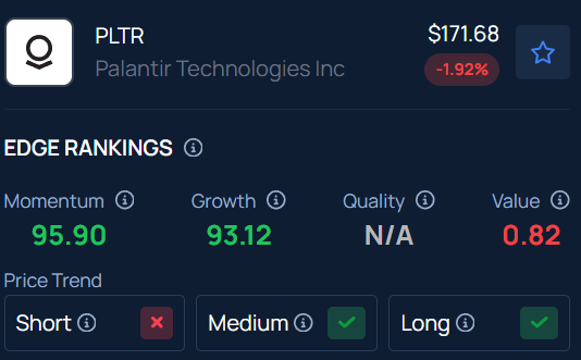Benzinga’s Edge Stock Rankings highlight that PLTR has a Growth score of 93.12. Track the performance of other players in this segment.