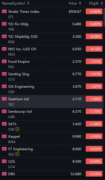 STI fell 0.9%; Yangzijiang Shipbuilding fell 5%; Nio fell 4%; SIA Engineering, Seatrium, and Sembcorp fell 2%.