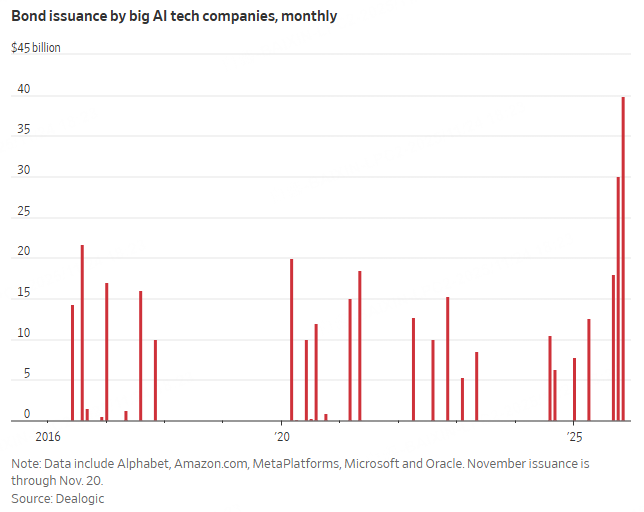 Since the start of September, so-called AI hyperscalers Amazon.com, Alphabet, Meta Platforms and Oracle have issued nearly $90 billion of investment-grade bonds, according to Dealogic, more than they had sold over the previous 40 months.