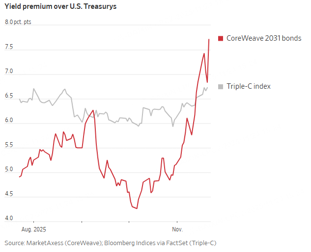 Other companies already are operating in that smaller debt market. Those include CoreWeave, the lone major AI cloud provider with subinvestment grade bonds. Its bonds due in 2031 that were issued in July recently traded at 92 cents on the dollar. That translated to a roughly 11% yield, about the same as the average triple-C rated bond -- at the bottom of the ratings spectrum.