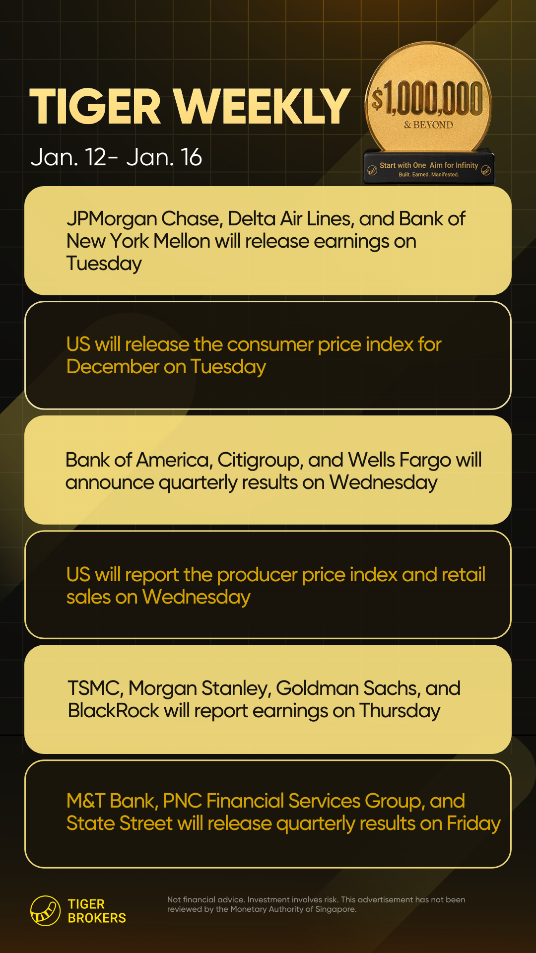 JPMorgan Chase will report results on Tuesday, followed by Bank of America, Citigroup, and Wells Fargo on Wednesday. Goldman Sachs, Morgan Stanley, and TSMC will announce earnings on Thursday, while PNC Financial Services Group rounds out the week on Friday.