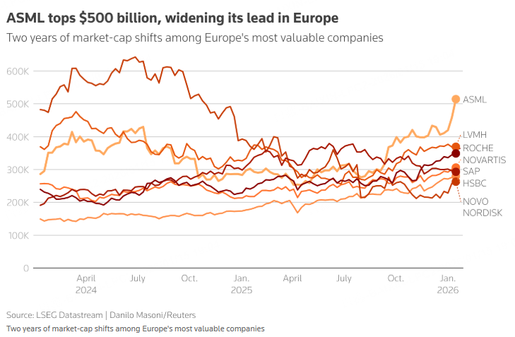 The news pushed ASML's shares 4.3% higher by 0952 GMT, totalling a rise of 23% in January alone and surpassing $500 billion in market capitalisation for the first time, extending its lead as Europe's most valuable company.