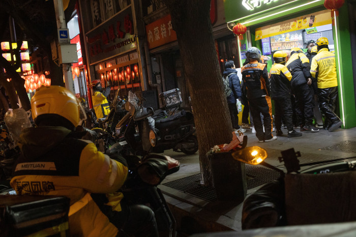 Delivery riders on motorcycles wait outside a shop in Beijing on Chinese New Year's eve.
