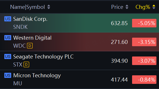 Other storage shares also slid on the news. Western Digital, Seagate Tech down 3% each; Micron down nearly 1%.