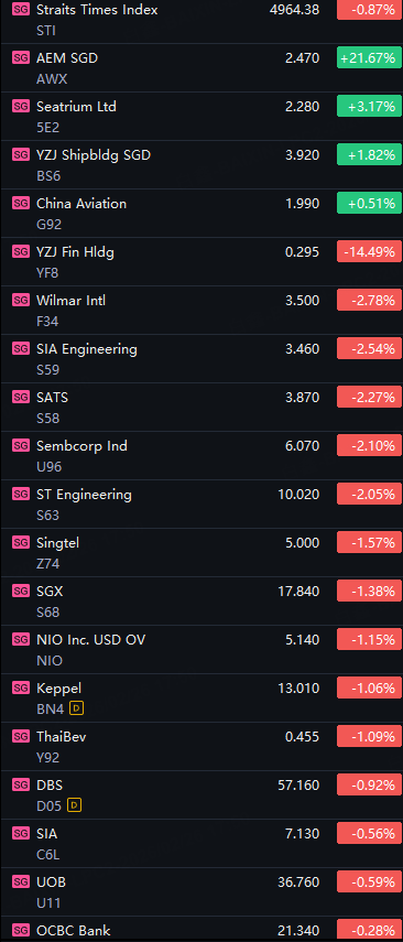 The Straits Times Index (STI), a key benchmark for the Singapore Exchange, ranged between 4,958.29 and 5,027.22 throughout the day. It ended the session at 4,964.38, down 43.35 points or 0.9% compared to Wednesday's close.