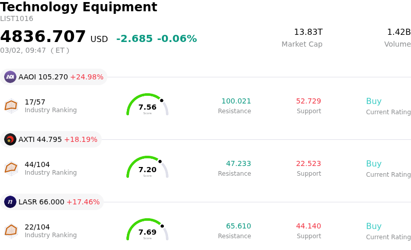 Amphenol Corp (APH) opened down by 5.11%. The Technology Equipment industry is down by 0.06%. The company underperformed the industry. Top 3 gainers of the industry: Applied Optoelectronics Inc (AAOI) up 24.98%; AXT Inc (AXTI) up 18.19%; nLIGHT Inc (LASR) up 17.46%.