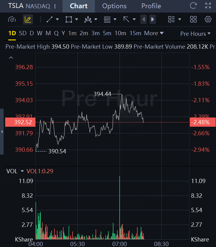 Shares of Elon Musk's car company were down 2.5% at $392.52 in premarket trading, while S&P 500 and Dow Jones Industrial Average futures were both down about 1.1%.