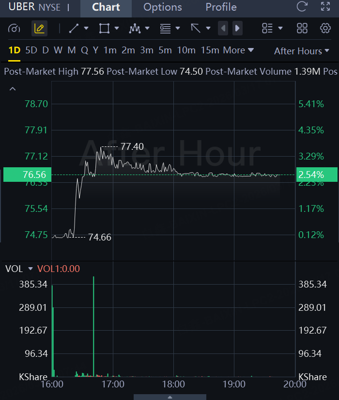 UBER Price Action: Uber shares were up 2.5% in after-hours on Monday, trading at $76.56 at the time of publication, according to Benzinga Pro.