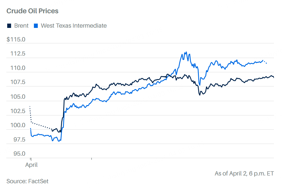 Meanwhile, Brent crude futures settled at $109.03 a barrel, down from their earlier high of $109.74 for an increase of 7.8% compared with Wednesday’s settle price.