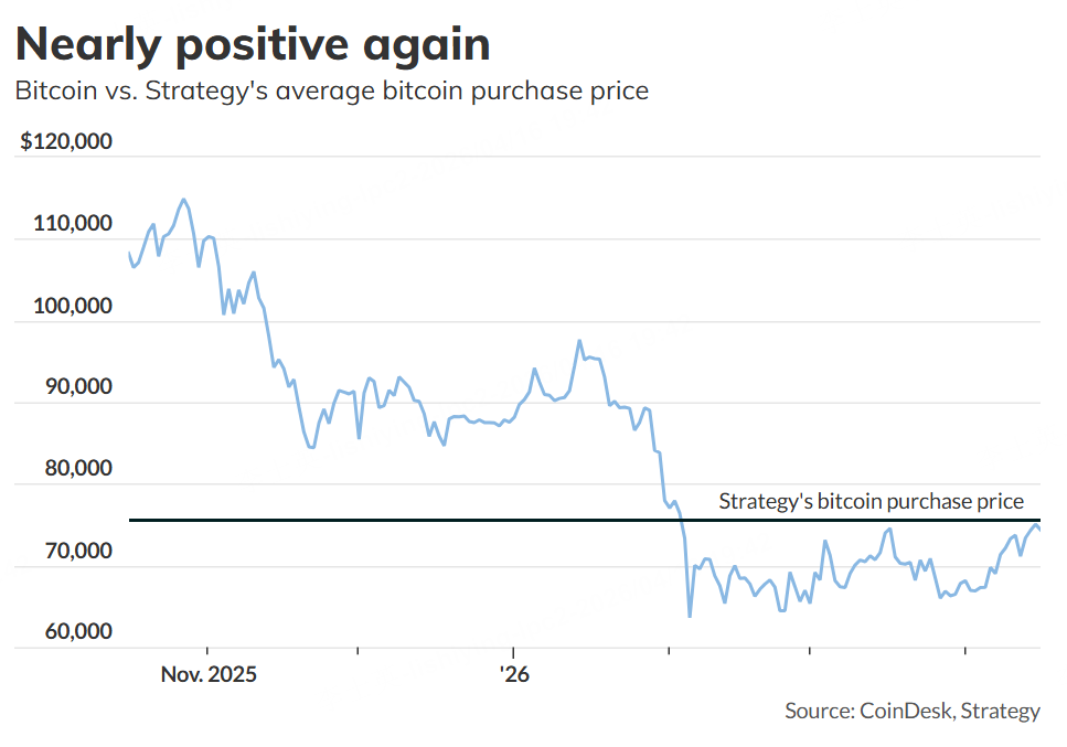 On Tuesday, the price of bitcoin spiked to an intra-day high of $75,900, putting Michael Saylor’s Strategy and its holdings of 780,000 coins back in the money compared to the average purchase price of $75,577.
